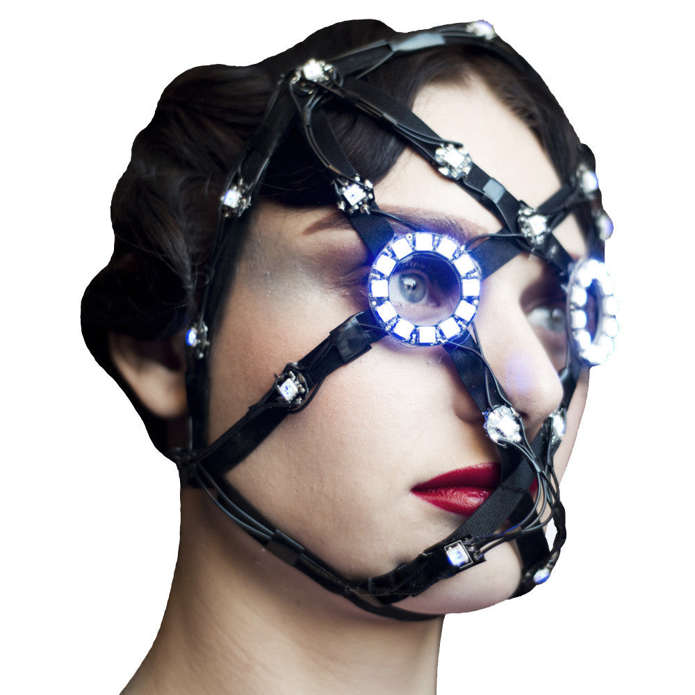 The LED Facemask is made of LED pixels and components, satin elastic and corset boning with adjustable metal sliders. Comes in black/blue LED component with rechargeable Battery Pack included. Made in New York City.